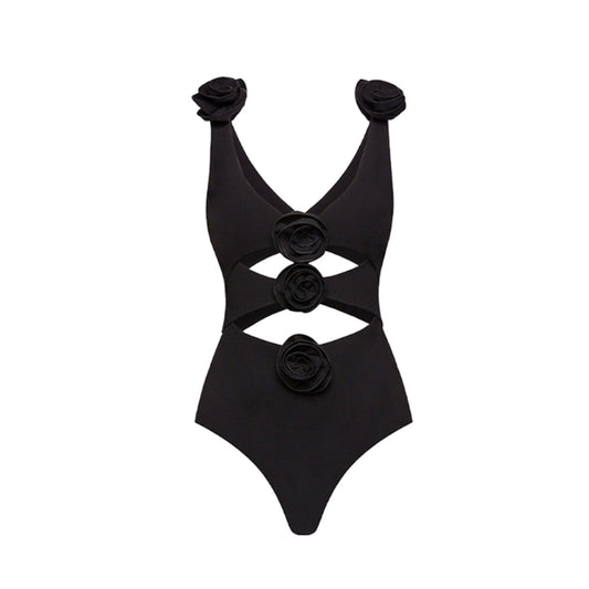 Badeanzug für Damen mit Blumenrüsche und modernen Ausschnitten von berg-feldt