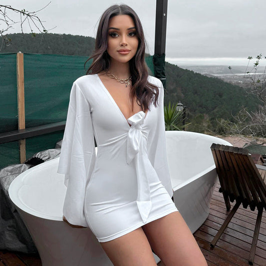 Wickel-Minikleid für Damen mit Glockenärmeln, tiefem V-Ausschnitt und fließendem Stoff von berg-feldt