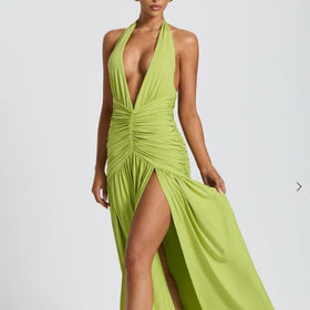 Schritt in die Eleganz mit unserem atemberaubenden Neckholder-Kleid mit tiefem Ausschnitt und Rüschen. Dieses exquisite Kleid ist für die moderne Frau entworfen, die bei jedem Event ein Statement setzen möchte.