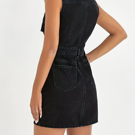 Stilvolles, vielseitiges Damen Denim-Kleid, perfekt für den Sommer. Ärmelloses Design mit elegantem Kragen, schmeichelt der Figur. Taillengürtel betont die Taille. Dekorative Taschen.