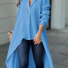 - Design: Stilvoller, asymmetrischer Schnitt mit verlängertem Rückenteil. - Material: Leichte, atmungsaktive Baumwollmischung. - Ärmel: Leicht hochkrempelbar für einen lässigen Look. - Knopfdetails: Klassische Knopfleiste mit dezenten Knöpfen. - Vielseitig kombinierbar: Perfekt für lässige Outfits, tagsüber oder abends.Diese Bluse ist vielseitig einsetzbar und kombiniert Stil und Eleganz. Ideal mit Jeans oder einer eleganten Hose.