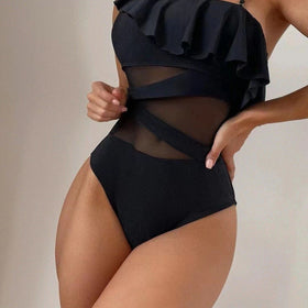 Eleganter einteiliger Badeanzug von berg-feldt für stilbewusste Damen. Asymmetrisches Rüschendesign und transparente Einsätze setzen verführerische Akzente. Hochwertiges Material für optimalen Tragekomfort und perfekte Passform.
