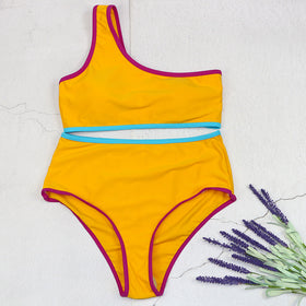 Stilvoller, bequemer Einteiler für Strand und Pool. Asymmetrischer Schnitt, lebendige Farben.
