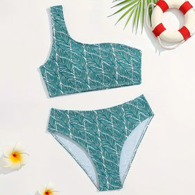 Stilvolles Damen Bikini-Set mit asymmetrischem Oberteil und tropischem Palmblattmuster. Perfekt für Strand und Pool.