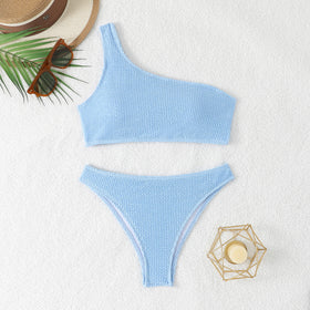 Entdecken Sie unser exklusives Damen asymmetrisches Bikini-Set. Das einzigartige Set kombiniert Stil und Komfort. Das Oberteil ist strukturiert und hat ein auffälliges, einseitiges Trägerdesign für einen trendigen Look. Der hoch geschnittene Slip sitzt optimal und betont die Silhouette. Hochwertiges, elastisches Material bietet Komfort und Bewegungsfreiheit – ideal für Strand und Pool.