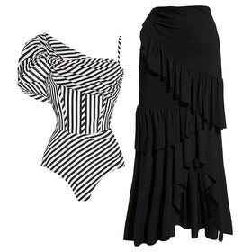 Entdecken Sie den eleganten Damen Einteiler mit asymmetrischem Design und voluminösem Rock von berg-feldt. Ideal für den Sommer, vereint dieses Outfit Stil und Komfort.
