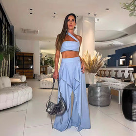 Trendiges Damen Zweiteiliges Ensemble für jede Gelegenheit. Asymmetrisches Oberteil und weit geschnittene Hose für optimalen Komfort.