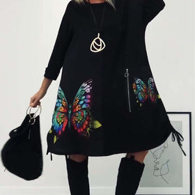 Entdecken Sie unser stilvolles, wadenlanges Kleid für den Alltag. Das asymmetrische Design und die bunten Schmetterlingsmotive an den Seiten sorgen für einen modernen Look.