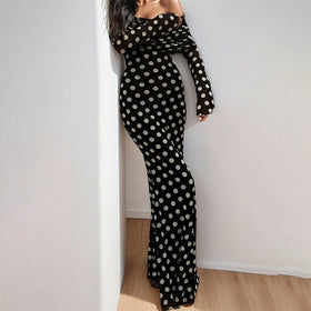 Entdecken Sie unser wunderschönes Damen Maxikleid mit auffälligem Polka-Dot-Muster und asymmetrischem Off-Shoulder-Design. Perfekt für Partys und besondere Anlässe.