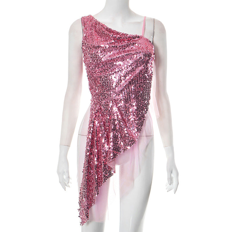 Beleuchten Sie jeden Anlass mit unserem atemberaubenden asymmetrischen Pailletten-Überwurf-Top. Dieses fesselnde Stück mit einseitiger Silhouette und schimmernden Pailletten erzeugt einen glamourösen Effekt.