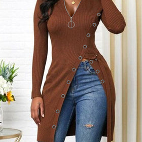 Elegantes, modisches Strickkleid mit asymmetrischem Schnitt und Knopfleisten. Komfort und Stil für Alltag und besondere Anlässe.