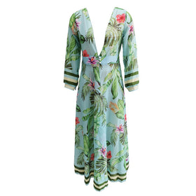 Azurblaues Design mit floralen Mustern, tiefem V-Ausschnitt und weiten Ärmeln. Integrierter Gürtel für eine taillierte Passform.