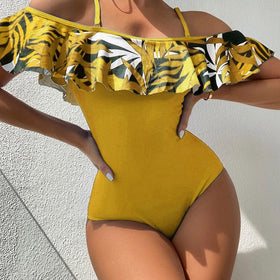 Badeanzug für Damen, Einteiler mit Volant und tropischem Muster von berg-feldt