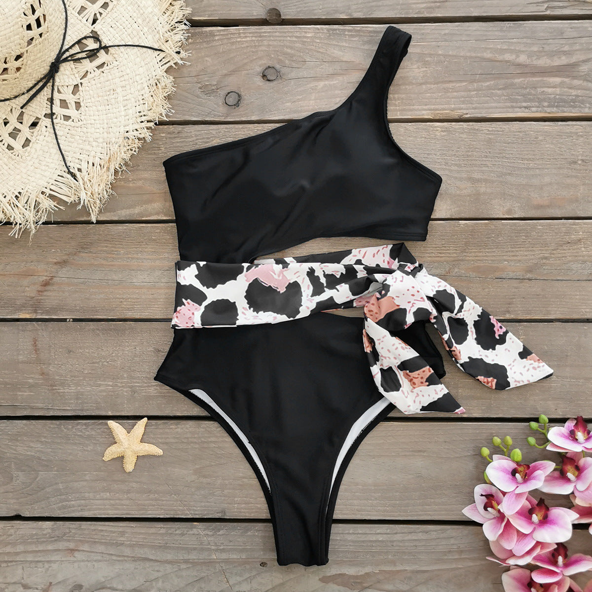 Ultimativer Komfort und Stil für modebewusste Frauen: Dieser asymmetrische Damen-Badeeinteiler setzt Ihre Silhouette perfekt in Szene. Der elegante Bindegürtel betont die Taille.