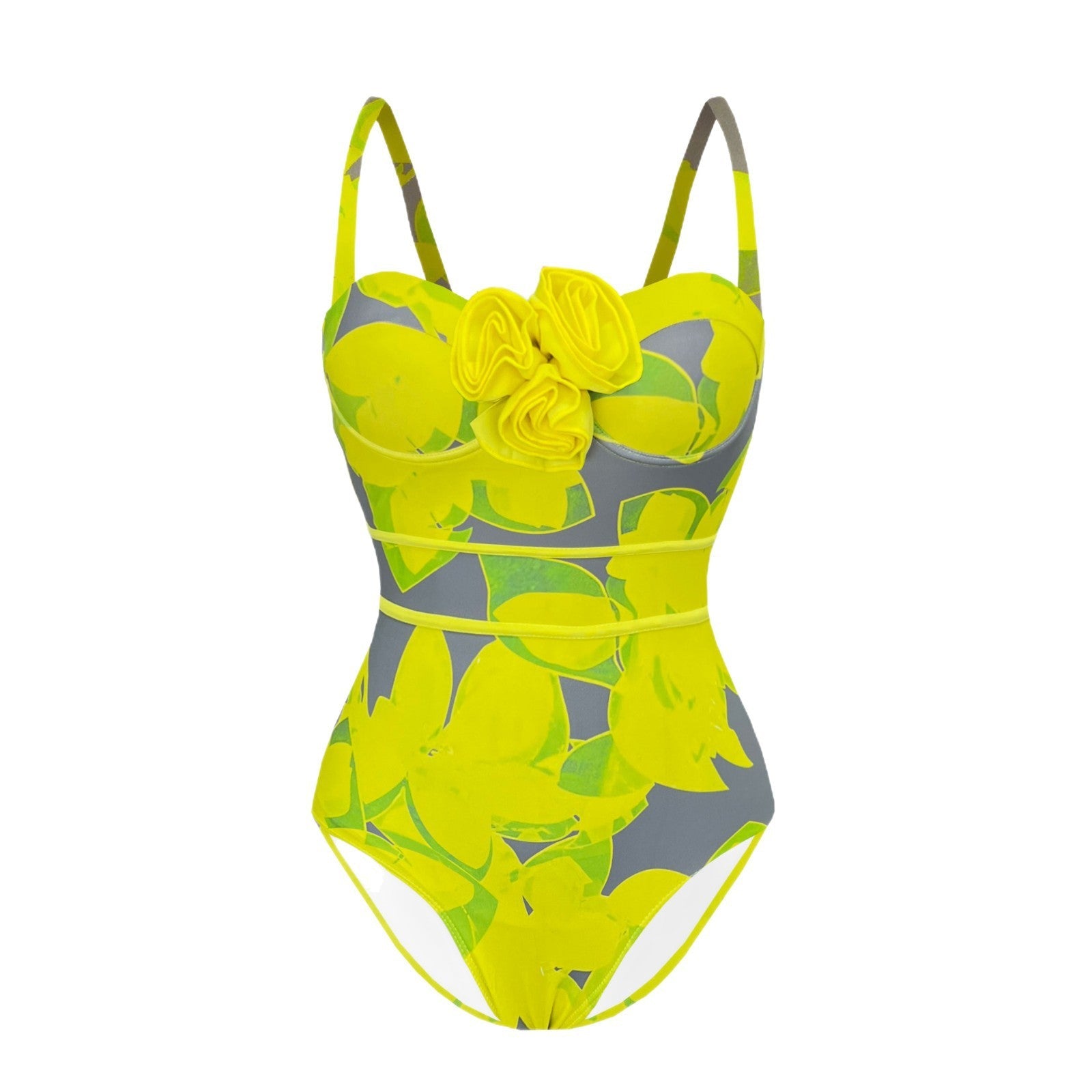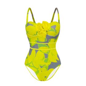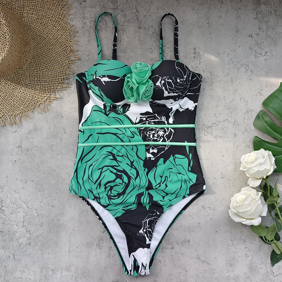Stilvoller, einzigartiger Damen Einteiler mit Blumenapplikation und Rüschen. Schmeichelhafte Silhouette, maximaler Komfort und Unterstützung. Ideal für Strand und Pool.