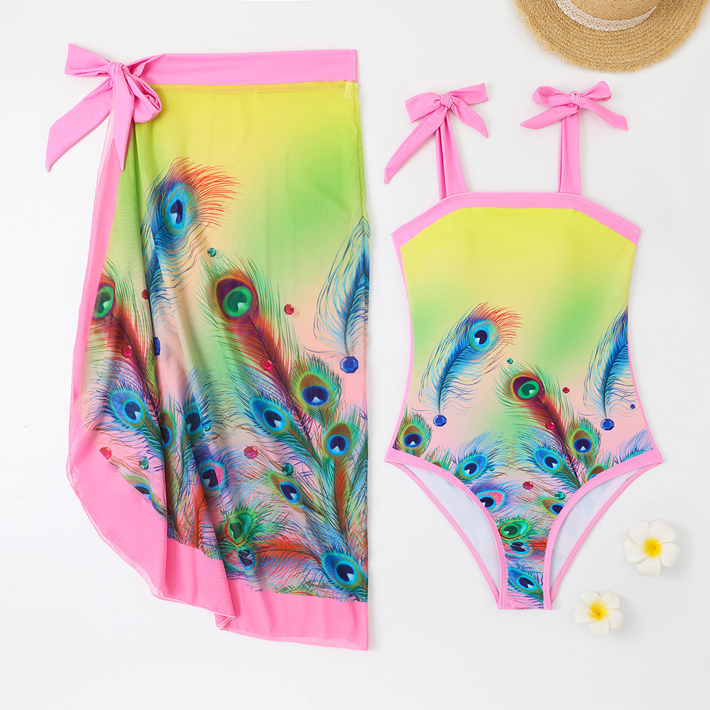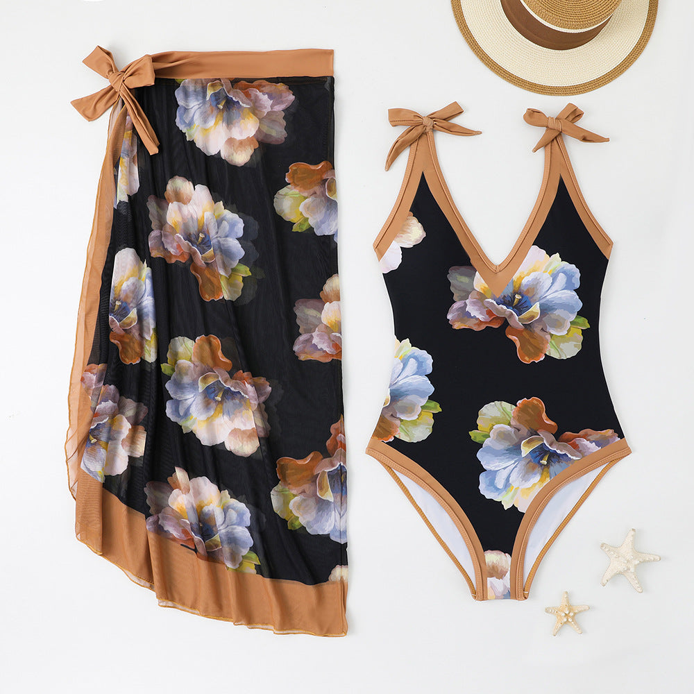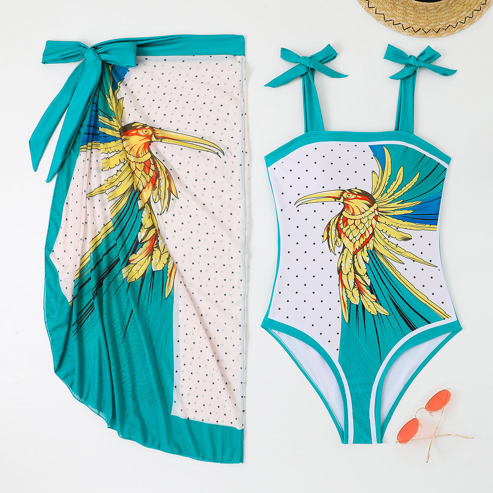 Badeanzug für Damen mit buntem Design und passendem Wickelrock von berg-feldt