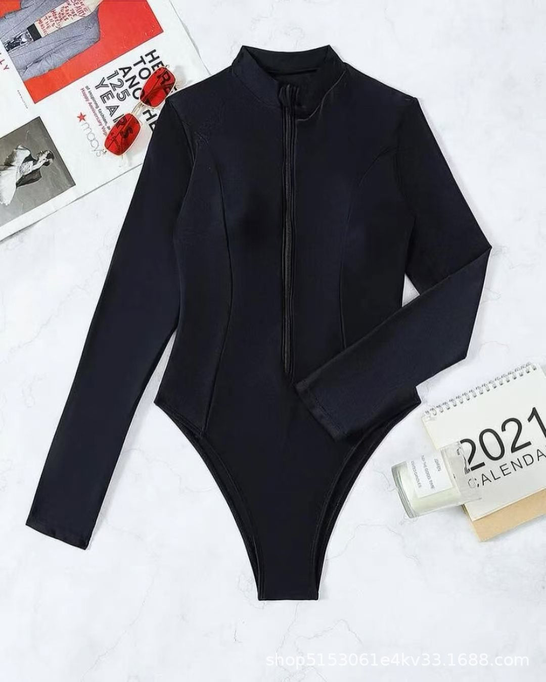 Badeanzug für Damen mit langem Arm, Stehkragen und Reißverschluss von berg-feldt