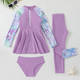Stilvolles und bequemes Schwimmsport-Outfit von berg-feldt: Langärmliges Oberteil mit Reißverschluss und fließender Rockteil. Bunte Raglanärmel mit modischem Muster. Feuchtigkeitstransportierendes und elastisches Material. Inklusive Bikini-Höschen.