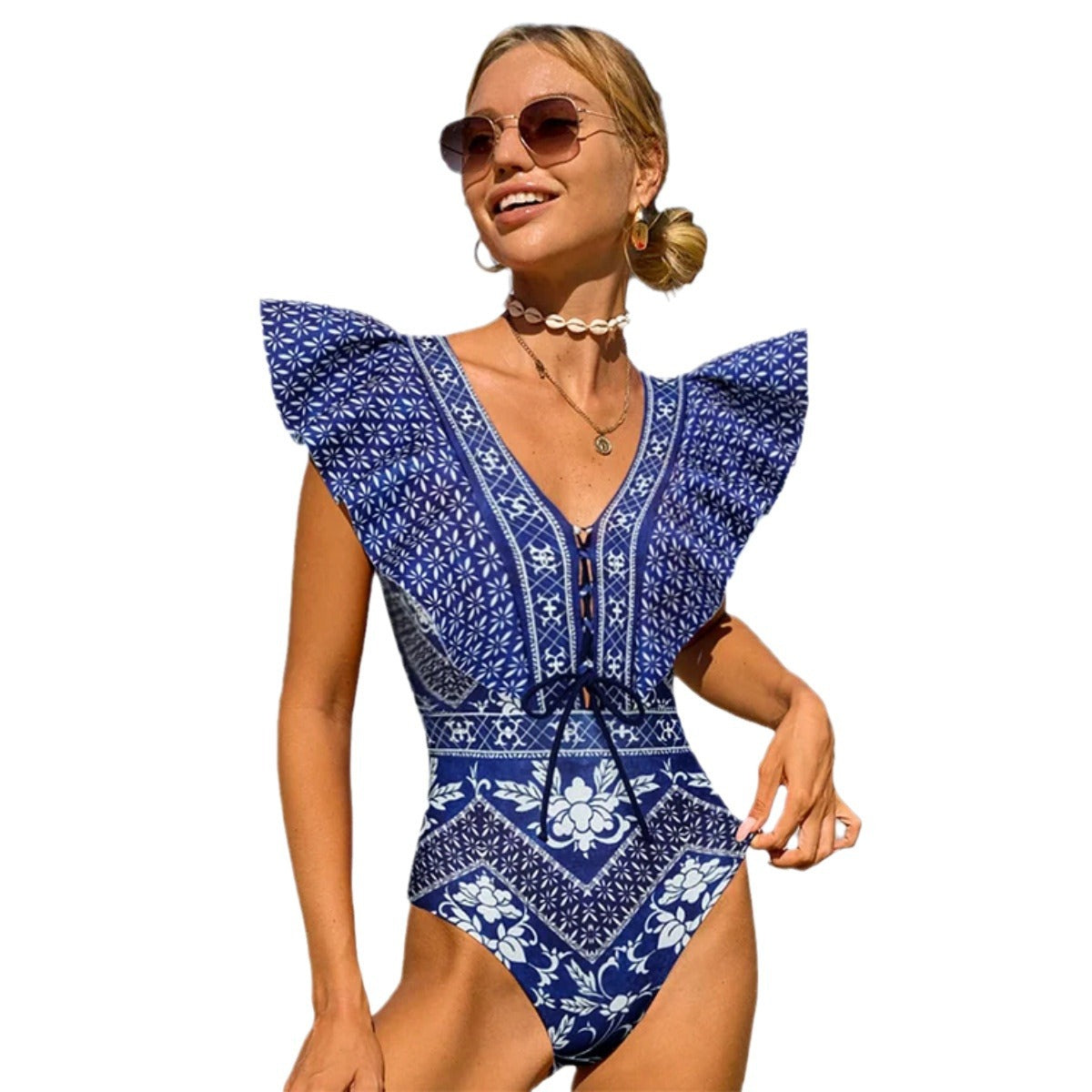 Entdecken Sie unseren Damen Einteiler Badeanzug – perfekt für Ihren nächsten Strandurlaub. Stilvolles Modell mit voluminösen Rüschen an den Schultern und tiefem V-Ausschnitt.
