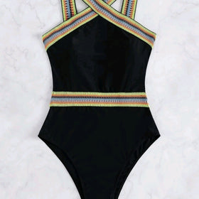 Badeanzug für Damen, unifarben mit modischen Kreuzträgern und buntem Berg-Feldt-Design