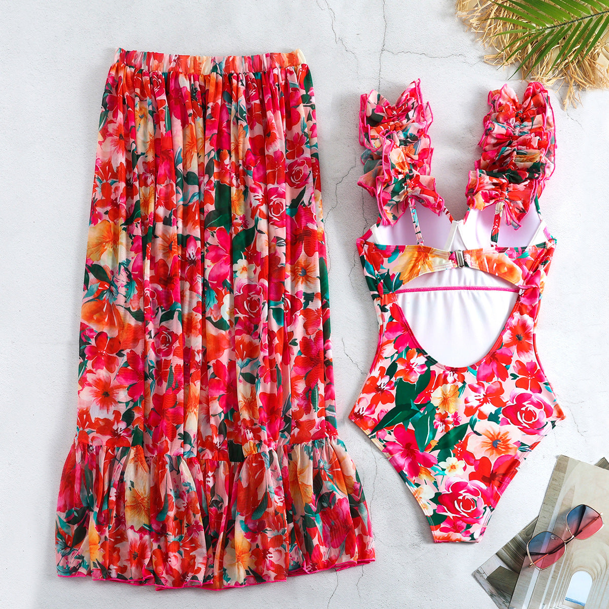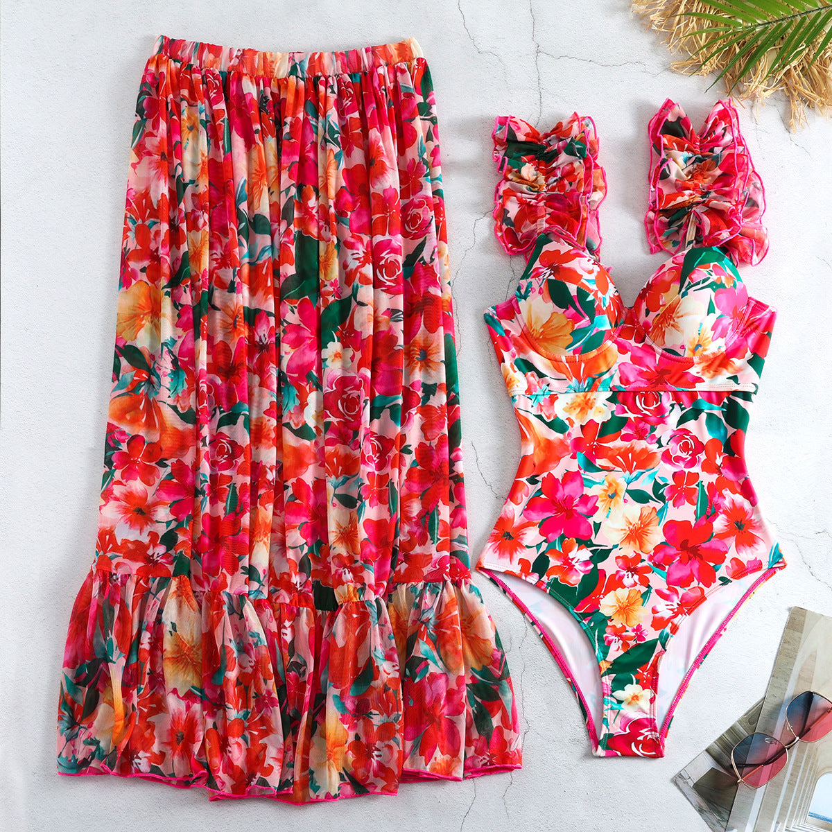 Traumhaftes Damen Badeanzug-Set: stilvoller Badeanzug mit floralen Rüschen & fließender Rock – perfekt für Strand & Pool!