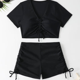 Dieses Badeset von berg-feldt kombiniert funktionalen Stil mit bequemer Passform – ideal für entspannte Tage am Strand oder Pool. Es besteht aus gerafftem Top mit V-Ausschnitt und kurzen Ärmeln.
