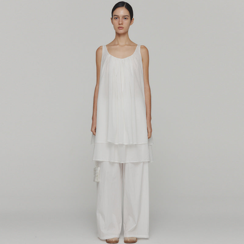 Elegantes Damen Layered Kleidungsset aus luftiger Baumwolle für warme Tage und besondere Anlässe. Das Set beinhaltet ein Oberteil mit dezentem Faltenwurf und eine leichte, schwingende Hose.