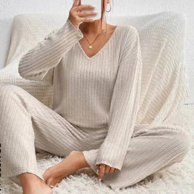 Bequemer Damen-Strickanzug mit V-Ausschnitt...