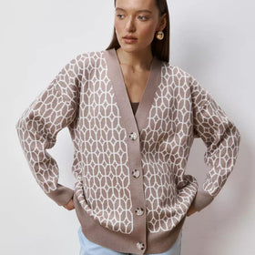 Trendiger Damen Strickcardigan mit modernem geometrischem Muster – Stil und Komfort vereint. Lässiger Schnitt für Bewegungsfreiheit.