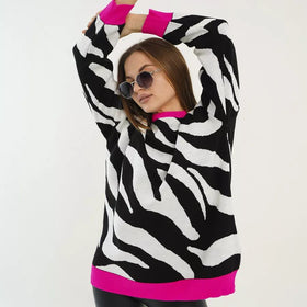Dieser Damen Strickpullover mit auffälligem Zebramuster vereint Style und Komfort. Ideal für legere oder elegante Looks. Die pinken Bündchen setzen einen modischen Akzent.