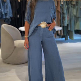 Komfort und Stil vereint: lässiges Oberteil mit überschnittenen Schultern und weite Hose. Perfekt für entspannte Sommertage.