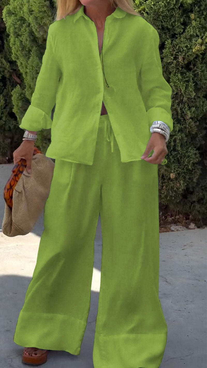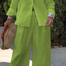 Entdecken Sie unser lässiges, luftiges Loungewear-Set für Damen. Perfekt für entspannte Tage und sommerliche Ausflüge. Leichtes Oberteil mit Hemdkragen und bequeme, weite Hose. Hochwertiges, atmungsaktives Material für maximalen Komfort.
