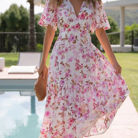 Betreten Sie eine Welt der Eleganz mit unserem Femme Floral Maxi-Kleid im schmeichelhaften Wickeldesign. Perfekt für Gartenpartys oder Sommerhochzeiten.