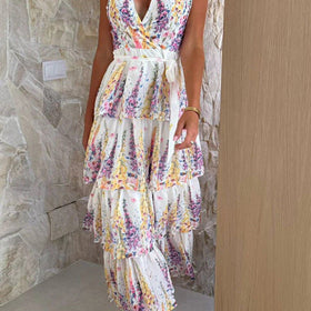 Erhöhen Sie Ihre Garderobe mit unserem atemberaubenden Femme Flowy Tiered Maxi Dress mit Wickeldetail von berg-feldt. Dieses Kleid ist für die moderne Frau entworfen, die Komfort sucht, ohne auf Stil zu verzichten.