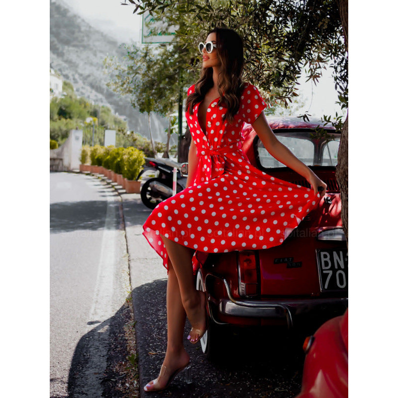 Schreiten Sie mit diesem entzückenden polka dot Wickelkleid in den Sommer und setzen Sie ein Zeichen, wo immer Sie hingehen!