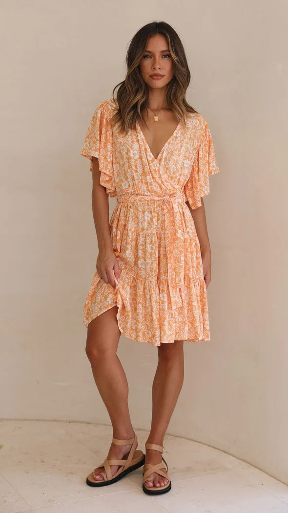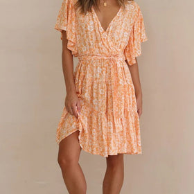 Das Femme Raffungen Wickelkleid vereint mühelose Eleganz. Es besticht durch einen schmeichelhaften V-Ausschnitt und zarte Rüschensleeves. Der Wickelstil betont die Silhouette und ist mit einem Bindegürtel in der Taille individuell anpassbar.