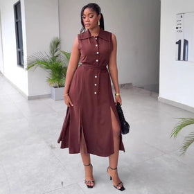 Stilvolles Damen Hemdblusenkleid mit Schlitzdetails und Taillengürtel. Modisches Design und hoher Tragekomfort für diverse Anlässe.