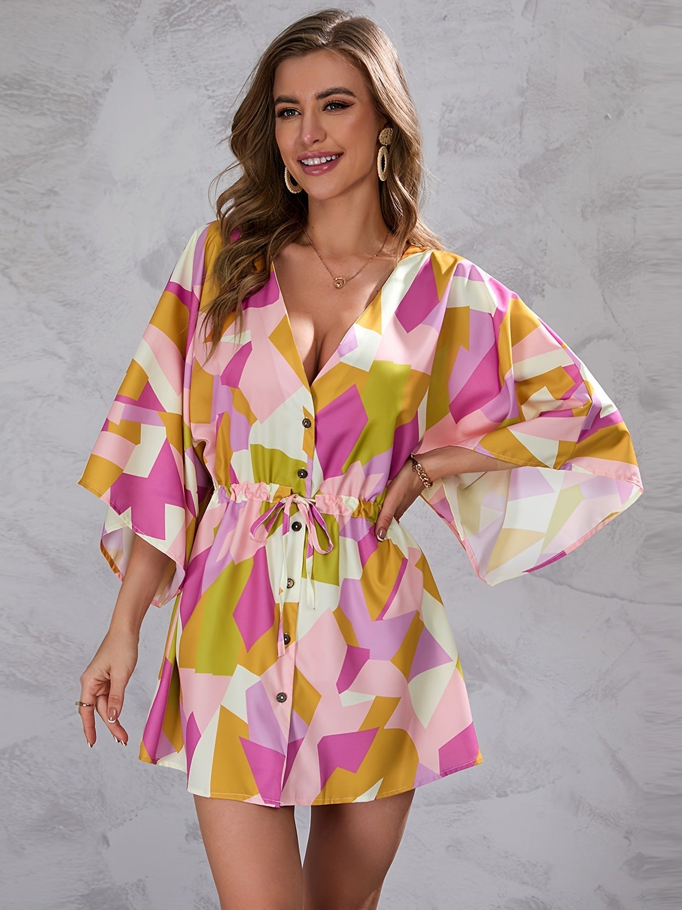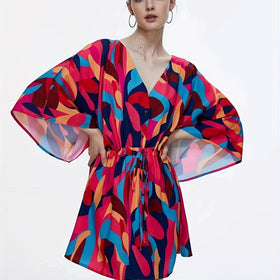Dieses atemberaubende Wickelkleid ist perfekt für lässige Ausflüge und Sommertreffen. Es besticht durch ein auffälliges, abstraktes Muster und vereint Komfort und Stil.