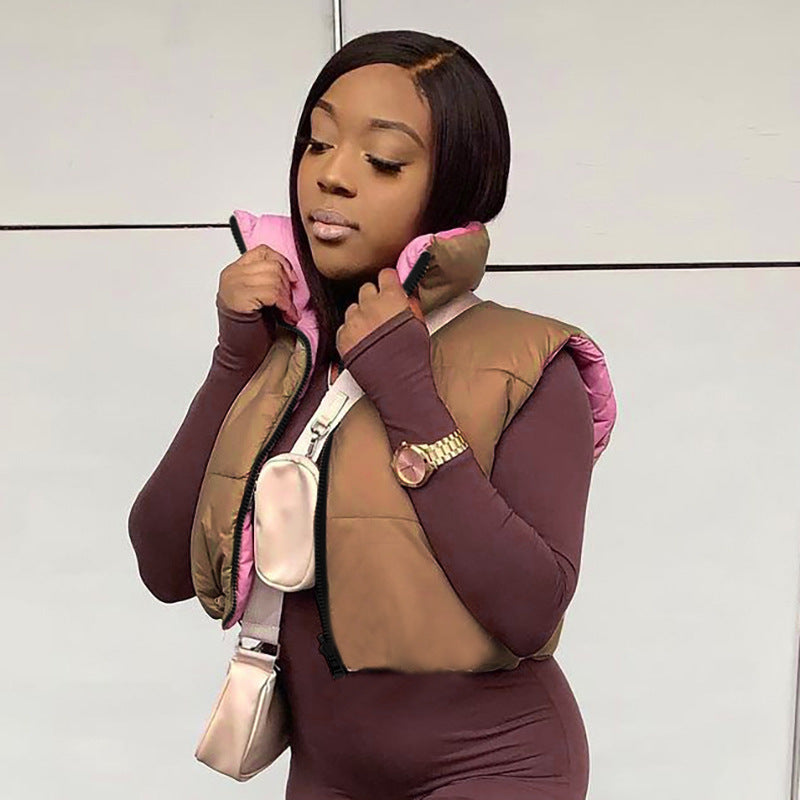 Heben Sie Ihren Stil mit der Femme Color-Block Utility Puffer-Weste berg-feldt hervor – Mode trifft Funktionalität!