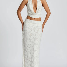 Entfesseln Sie Ihre innere Eleganz mit dem atemberaubenden Femme Halter-Neck Floral Overlay Maxi Dress von berg-feldt. Perfekt für besondere Anlässe oder ruhige Strandausflüge, kombiniert dieses exquisite Stück Raffinesse mit Komfort.