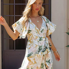 Stilvoll auftreten mit diesem atemberaubenden Rüschen Blumen Wickel Mini Kleid, designt für moderne Frauen, die Charme und Komfort suchen. Wunderschönes Blumenmuster, das Frühling und Sommer einfängt.