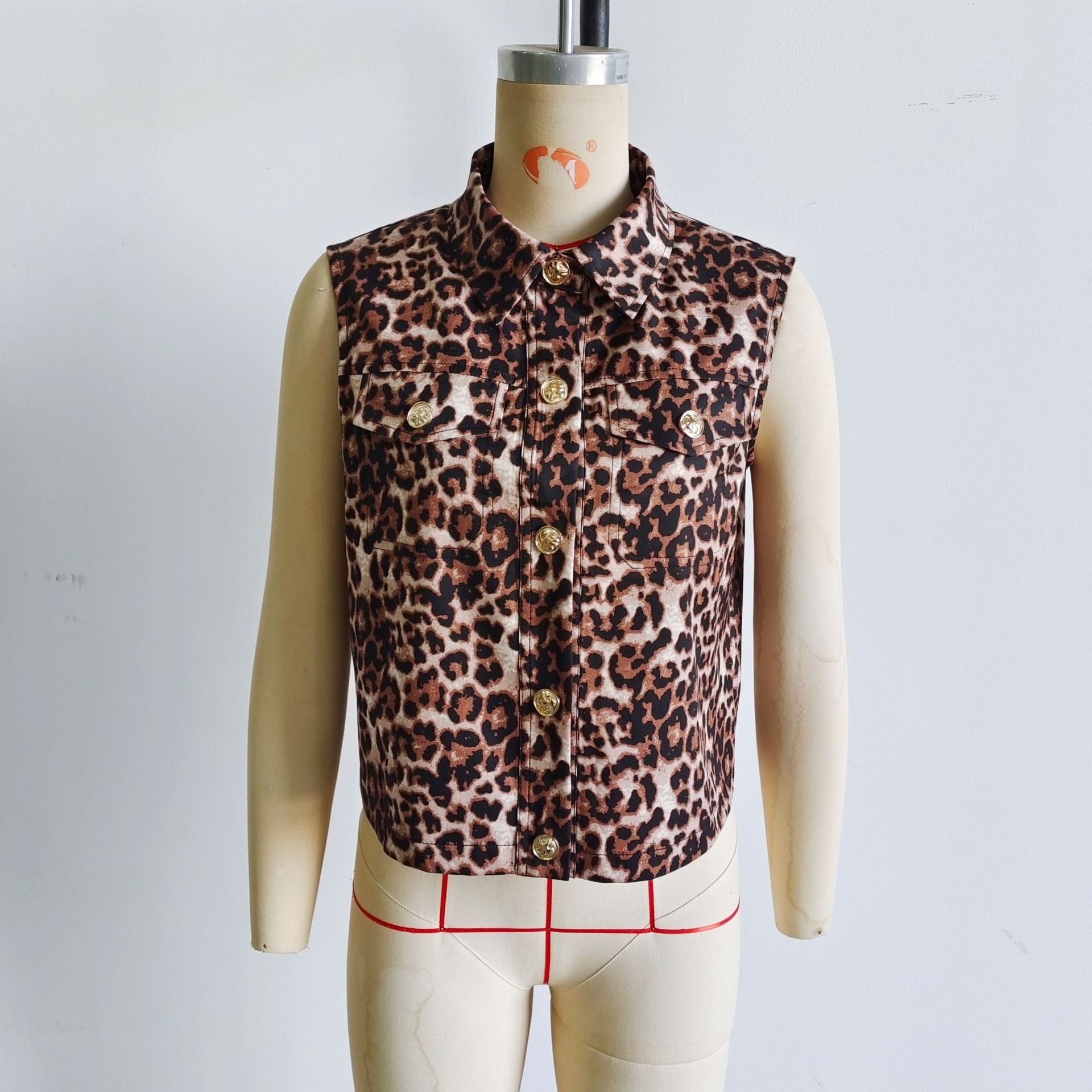 Unsere atemberaubende ärmellose Utility-Weste aus Denim vereint Stil und Funktionalität für die moderne Frau. Das auffällige Leopardenmuster macht sie zum Hingucker und ideal für jede Garderobe.