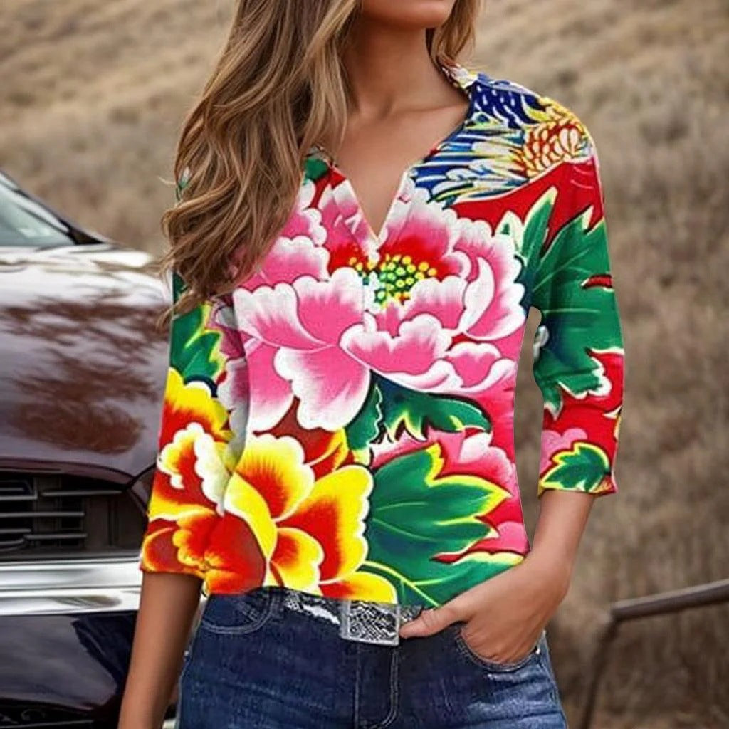 Unser Femme Sonnenblumen-Druck-Top mit Knopfverschluss vereint Eleganz und Komfort. Das Top besticht durch ein lebhaftes Sonnenblumenmuster.