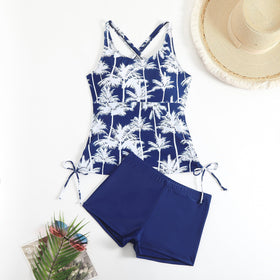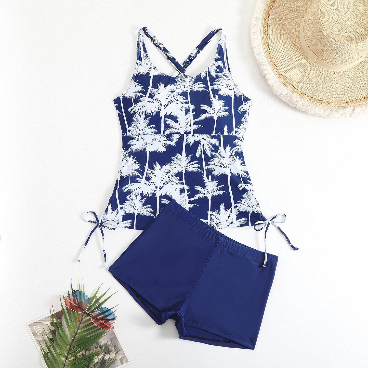 Elegantes Swim Tankini-Set für Damen, perfekt für Strand und Pool. Das Set besteht aus einem Tankini-Oberteil mit Palmendruck und passenden Shorts.