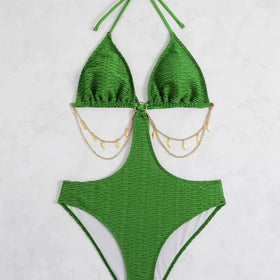 Stil und Komfort vereint: Das berg-feldt Cut-Out-Detail Triangle Bikini Set für selbstbewusste Frauen. Das Triangel-Oberteil mit verstellbaren Bändern betont Ihre Figur. Das Cut-Out-Design hebt Ihre Kurven hervor, glänzende metallische Kettenakzente setzen luxuriöse Akzente.